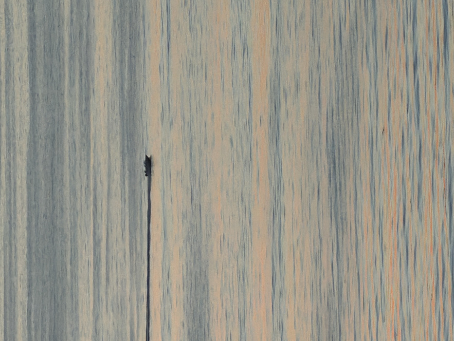 A vertical abstract image displays a blend of muted blues, creams, and hints of orange. The dominant pattern consists of parallel, streaking lines that create a textured effect. On the left side, a dark, vertical line extends upward, appearing like a thin pole with a small, indistinct object perched at the top. The overall impression is of water, perhaps with a distant marker.