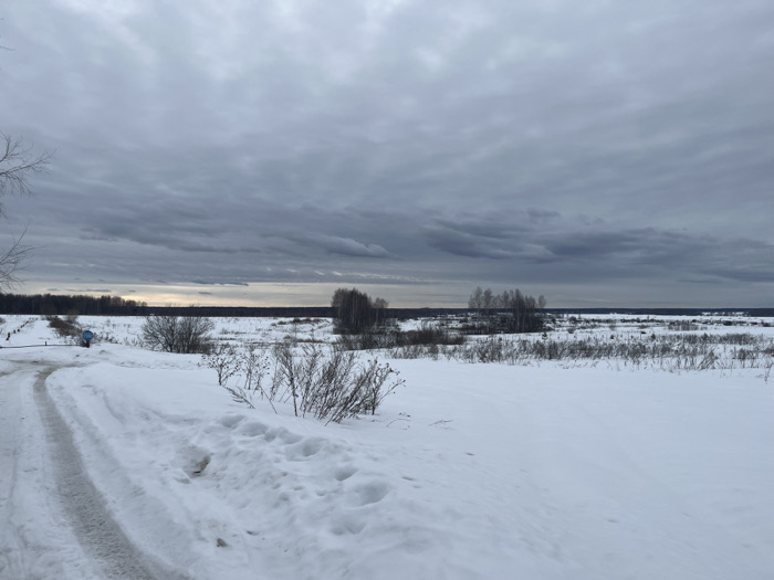 The scene depicts a wide, snow-covered landscape under an overcast sky in Kalinino, Russia. The foreground features a snow-laden unpaved path curving from the lower left towards the mid-left, exhibiting tire tracks or footprints. To the immediate right of the path, a field of undisturbed snow is interspersed with patches of dry, dark vegetation. A blue cylindrical object, possibly a barrel or container, is partially visible near the path in the left midground. The middle ground is characterized by extensive snow-covered fields dotted with clusters of bare deciduous trees, including a distinct group of lighter-barked trees towards the right. A dark, dense line of trees forms a prominent horizon across the mid-distance, behind which a narrow band of lighter sky is visible, suggesting a low sun or a break in the clouds. The sky above is entirely covered by a thick layer of dark, uniform grey clouds. No people, active subjects, or explicit interactions are present. The environment indicates a cold, winter setting.
