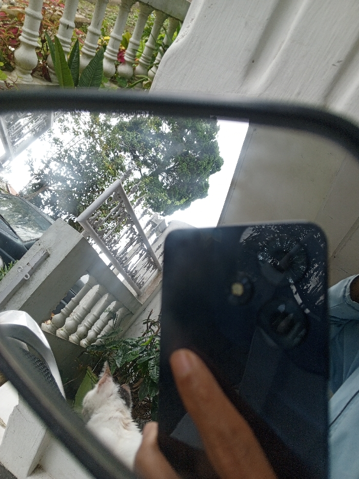 A rearview mirror reflects a scene of a white balcony with balusters, a tree, and a glimpse of a car. A hand holds a dark-colored phone in front of the mirror, partially obscuring the reflection. A white and grey cat is visible in the lower left corner of the reflected scene, looking upwards. A hint of a person wearing a light blue shirt is also reflected on the phone. The reflection reveals a mix of foliage and a bright, possibly overcast sky.