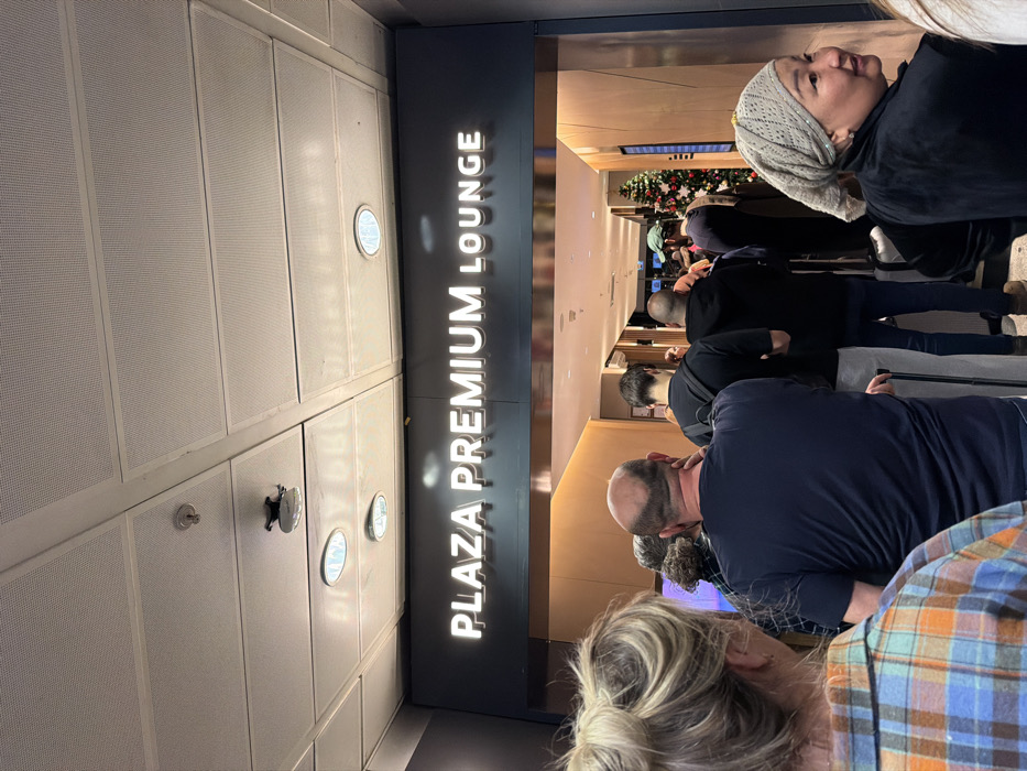 A queue of people wait to enter the Plaza Premium Lounge. The sign, in vertical white text, is positioned next to the doorway. Individuals of various ages and wearing diverse clothing are visible, indicating a mix of travelers. A Christmas tree is visible inside the lounge, suggesting it is the holiday season. The ceiling, with recessed lighting, is visible next to the lounge entrance.