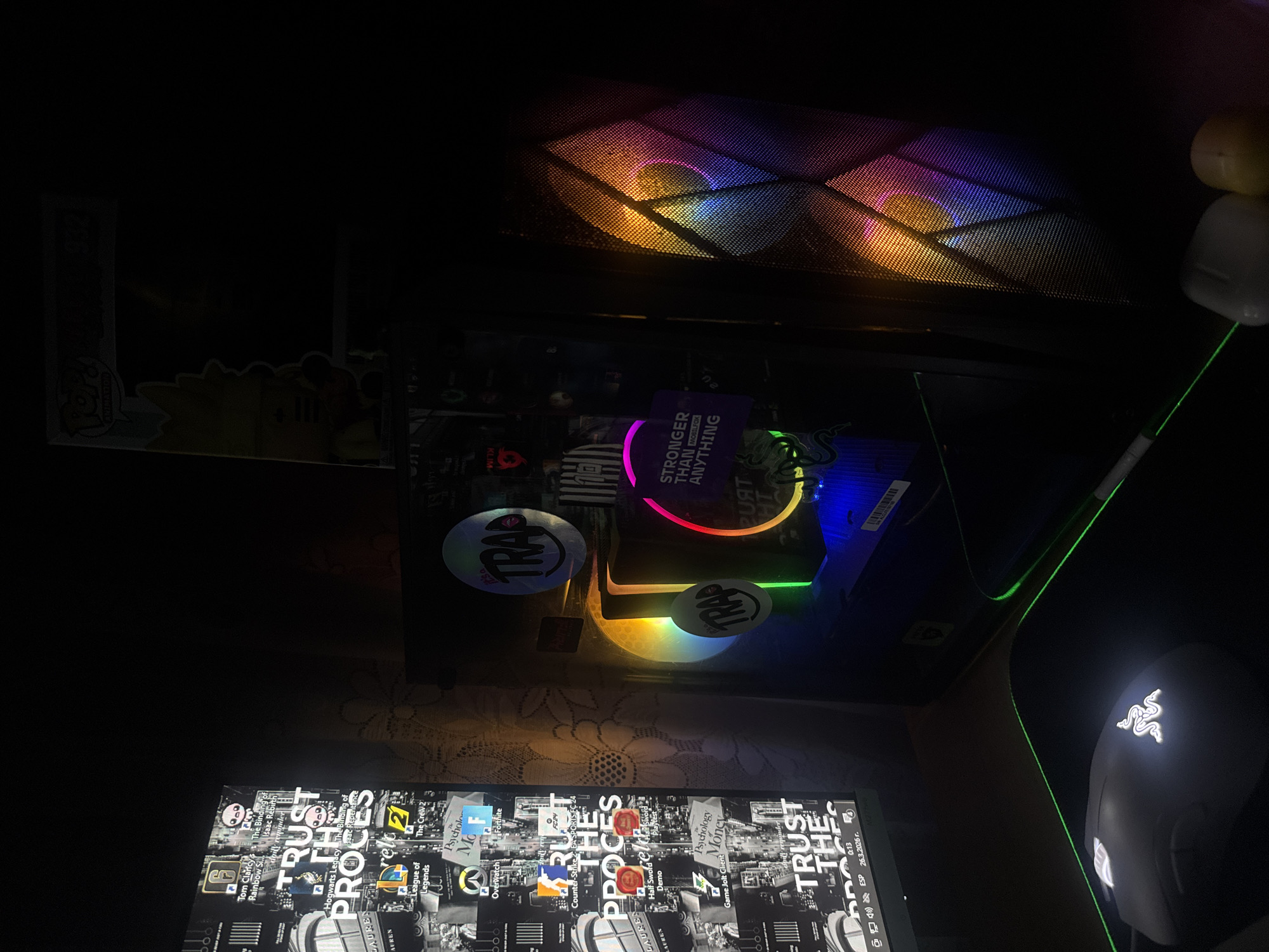 The image depicts a dimly lit personal computer setup located in a private room in Pleven, Bulgaria. A dark desk surface holds various electronic components. On the left, a vertical computer monitor displays a desktop background featuring black-and-white urban imagery overlaid with "TRUST THE PROCESS" text. Numerous game icons are visible, including "Tom Clancy's Rainbow Six," "The Binding of Isaac Rebirth," "Hogwarts Legacy," "League of Legends," "Overwatch," "Fortnite," "Counter-Strike 2," "EA SPORTS FC 24," "Half-Sword Demo," and "Psychology Money." The Windows taskbar shows the date "26.3.2025 г." On the wall behind the monitor, a light-colored wallpaper with a floral or lace-like pattern is partially visible. In the center, a desktop computer tower with a transparent side panel glows with internal RGB lighting. Two circular "IT'S A TRAP" stickers with smiling faces are affixed to the side panel, along with a purple rectangular sticker stating "STRONGER THAN ANYTHING MOBILFOX." The front of the computer tower features a mesh panel illuminated by multi-colored RGB lighting, creating a geometric pattern of orange, blue, and purple hues. Above the tower, a Funko Pop Animation figure #932, appearing to be Bart Simpson, is visible in its original packaging. On the desk in the foreground, a white Razer gaming mouse with a glowing green logo rests on a dark mouse pad, which is outlined by a thin, glowing green strip. To the right of the mouse pad, two light-colored, possibly soft objects are partially visible. No individuals are present in the scene.