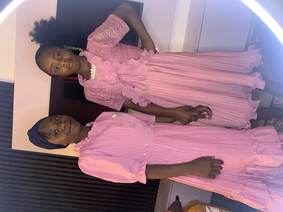 Two young females are depicted indoors in Jos, Nigeria, posing for a photograph. The subject on the left, with dark skin and a dark blue headwrap, wears a long, pleated pink dress featuring a ruffled collar, puffed elbow-length sleeves, and a tiered ruffled hem. The dress is embellished with rhinestones and pearl-like beads on the bodice and waistline. She offers a slight smile and looks directly at the camera. Her right hand is held by the other subject. The subject on the right, also with dark skin, has dark hair styled in an afro puff with colored beaded braids framing her face. She wears a sleeveless, pleated pink dress with a ruffled hem, layered with a short-sleeved, ruffled, lace-patterned pink bolero with a front drawstring. Her left hand is placed on her hip, and she holds the left subject's hand with her right. Both subjects look toward the camera. The background features a dark, vertically ribbed surface on the left, and a large dark rectangular screen, possibly a television, mounted on a light-colored console to the right. A bright circular light source, consistent with a ring light, is partially visible at the bottom right. The flooring appears to be a patterned dark rug or carpet.