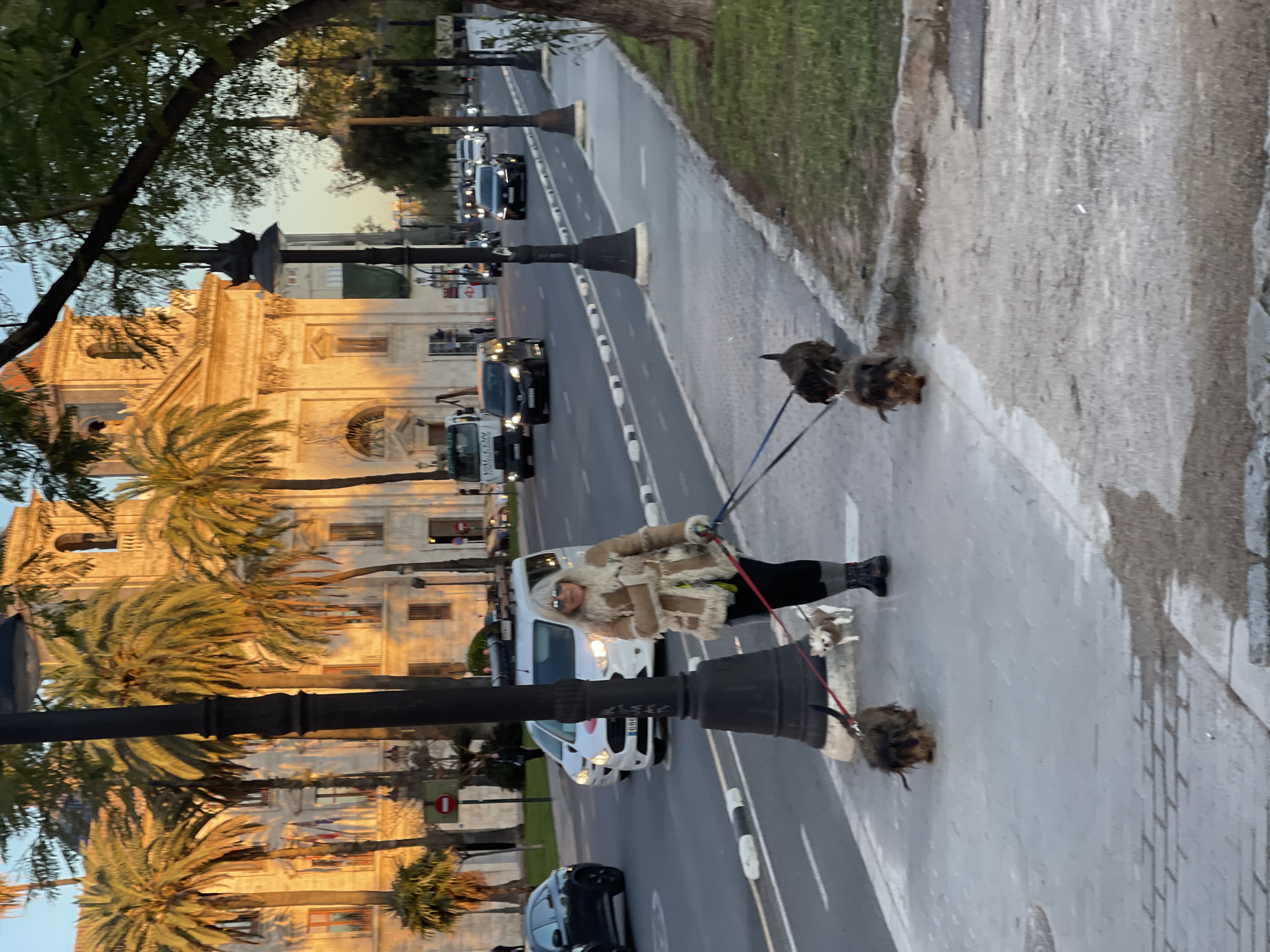 A woman, with blond hair and sunglasses, wearing a fur-trimmed jacket and black pants, walks three dogs on leashes down a sidewalk in Valencia, Spain. The scene is partially obscured by streetlamps and palm trees. In the background, a large, ornate building bathed in warm light suggests the city's historical architecture. A street with cars runs parallel to the sidewalk.