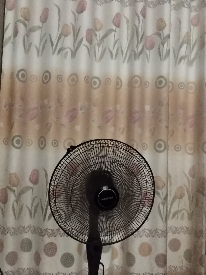 A black standing fan dominates the foreground, obscuring the curtain behind it