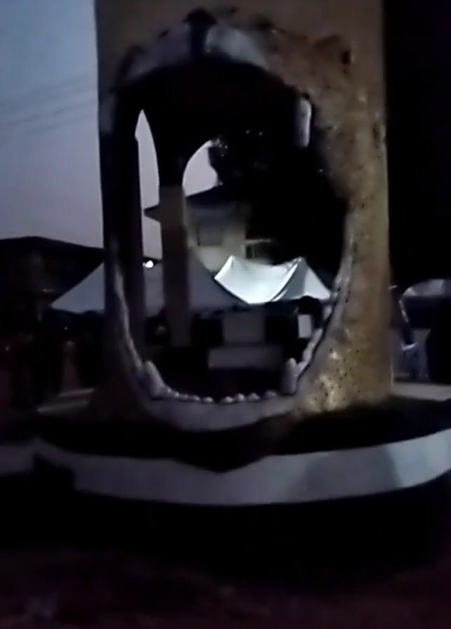 cylindrical structure with the image of a lion's head and open mouth cut out from it. The structure is set on a circular base painted with a black and white stripe. Behind the structure, in the open mouth area, is a building with a white roof. The sky is dark, suggesting that the video was taken at night. There are also hints of other structures and people in the background, but they are largely obscured by the darkness.