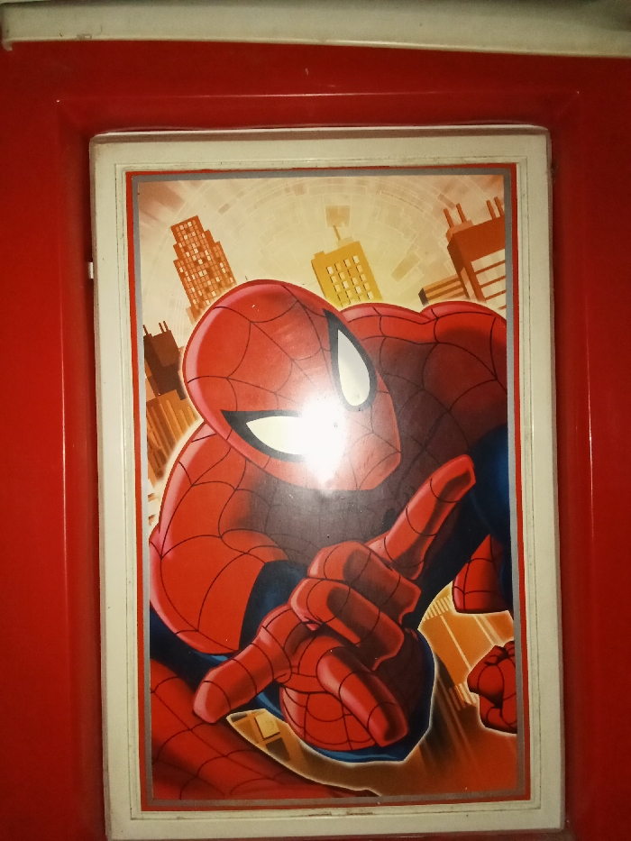The image displays a vertically oriented, framed illustration of the Marvel character Spider-Man, set within a red panel. The illustration depicts Spider-Man from the chest up, positioned slightly right of center, in a dynamic pose. He wears his iconic red and blue suit, detailed with black web patterns and large white eye lenses. His right arm is bent, with his hand extended forward, displaying the web-slinging gesture where his index and middle fingers are extended, and his ring finger and pinky are curled. A strong, bright light reflection obscures part of his head and the upper portion of his extended hand. The background of the illustration features a stylized, light-beige city skyline with various brown, orange, and yellow high-rise buildings. The framed illustration has a white inner border and a thin gray line along its perimeter. This framed piece is recessed into a larger, uniformly red surface, possibly a wall panel or door, with a narrow white horizontal strip visible at the top edge of this red surface. The scene is located in the city of Inxuba Yethemba Local Municipality, South Africa.