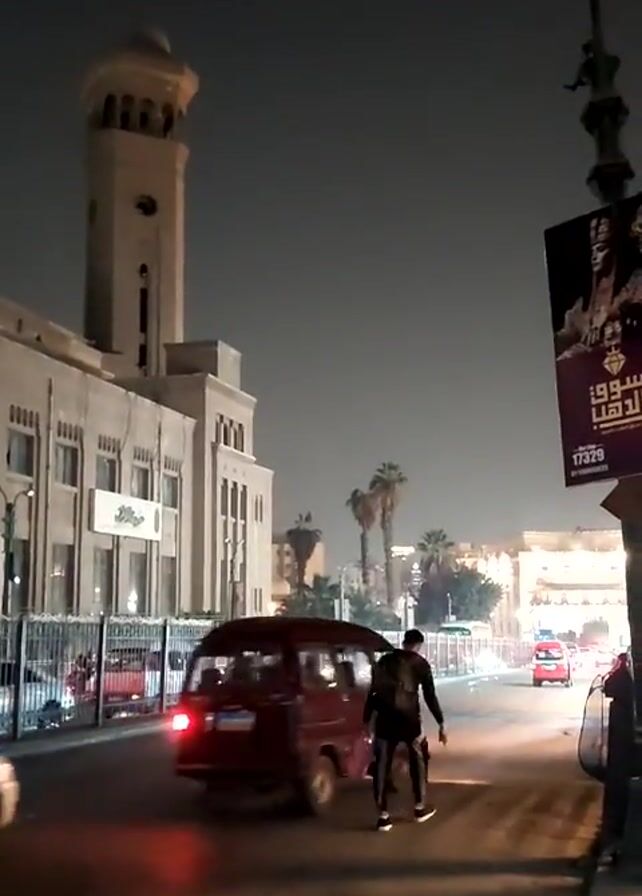 street scene at night. There's a tall, light-colored building with a tower on the left. A red van pulls up to the curb and people get out. Other cars are on the street. There are palm trees in the distance. A man walks in the foreground. A streetlamp and a poster are visible on the right side of the frame.