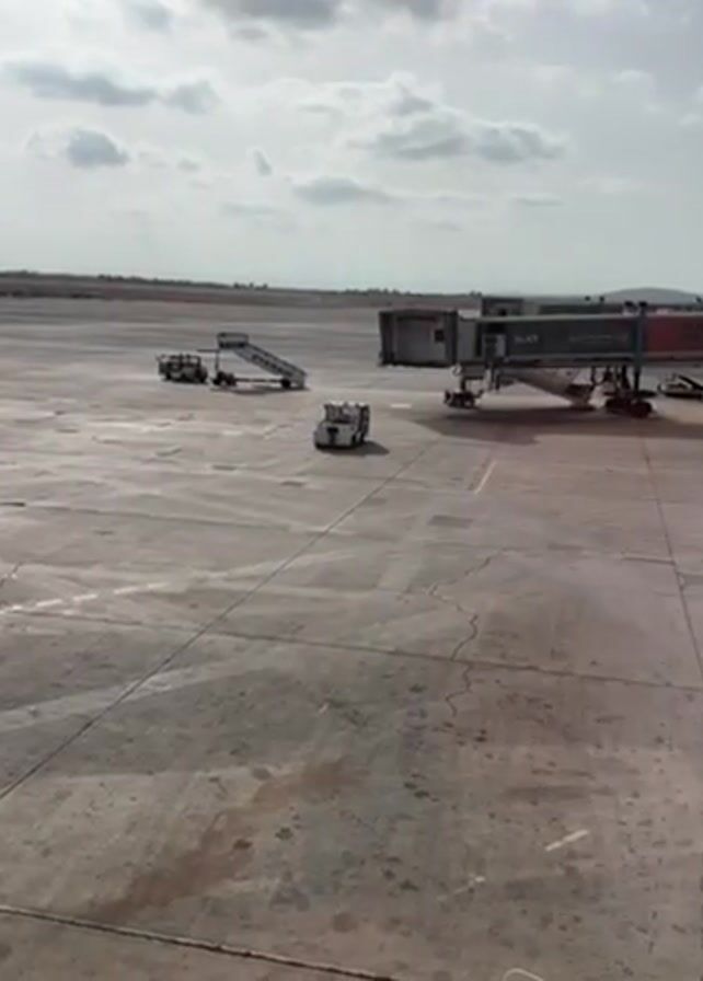 n airport tarmac on a cloudy day. There are two jet bridges connected to the terminal, along with two small baggage trucks and a set of stairs on wheels. The tarmac is made of concrete with various markings and stains. The background consists of a low hill and more overcast sky.