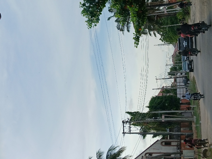 A street scene features utility poles with power lines against a cloudy sky. Vehicles, including cars and motorcycles, are traveling down the road. Buildings are visible along the side, obscured by trees. The shot is taken from ground level, tilting upwards to capture the sky and power lines.