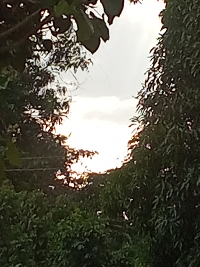 The image depicts an outdoor scene in Konongo, Ghana, dominated by dense, dark green foliage framing a central, irregularly shaped void. This void is intensely bright and overexposed, appearing white with yellowish-orange hues towards its lower segment, indicative of natural light from a bright sky or sun. The surrounding foliage, composed of leaves and branches, is largely silhouetted and occupies the left, top, and right portions of the frame. Faint, thin linear elements, consistent with either fine branches or utility wires, are discernible within the upper left foliage. No individuals, animals, or specific man-made structures are clearly identifiable within the scene.