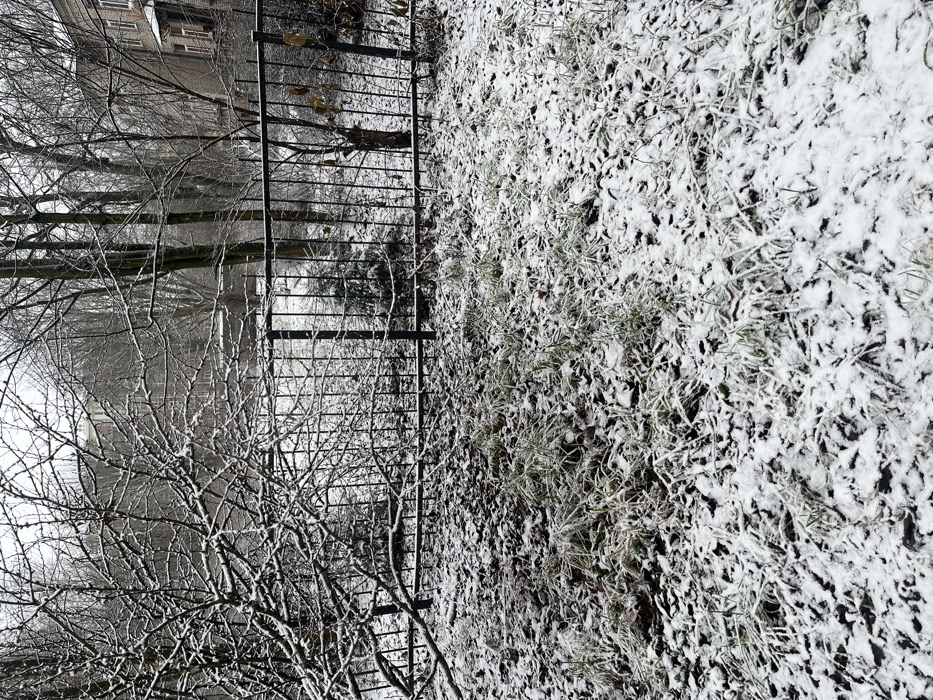 The image depicts a winter urban landscape in Saint Petersburg, Russia, under an overcast sky. The foreground features a patch of ground sparsely covered with fresh snow over dark soil, intermingled with visible green grass blades and fallen brown leaves. A black metal fence, constructed from vertical bars and horizontal rails, extends across the midground. The fence exhibits minor structural irregularities, with some sections appearing slightly bent. Behind the fence, multiple bare deciduous trees, their branches dusted with snow, dominate the scene. A small evergreen conifer is visible directly behind the fence, near the center. In the background, partially obscured by the trees, is a multi-story building with a light-colored facade and visible windows, typical of city architecture. No individuals, animals, or active interactions are present in the scene. The environment indicates a cold, post-snowfall setting within a city park or garden area adjacent to residential or commercial structures.