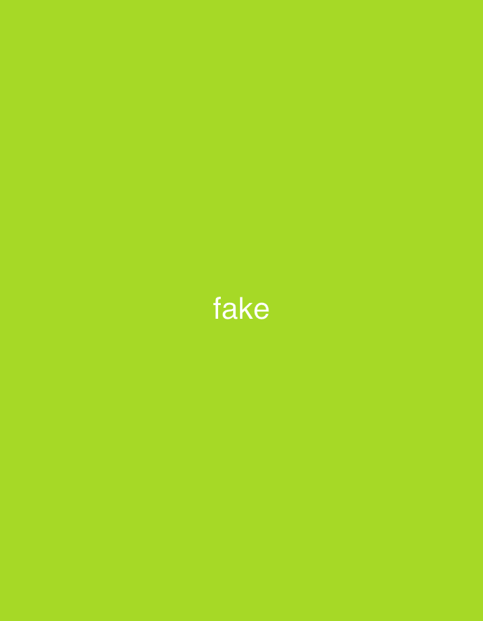 A light green background fills the frame. Centered horizontally and vertically, the word "fake" appears in white sans-serif font. The image's simplicity emphasizes the single word, drawing focus to its stark message against the monochromatic backdrop. The overall aesthetic is minimalist and direct.