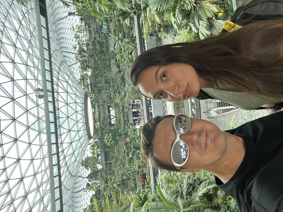 A man and a woman pose in front of a vast indoor garden enclosed by a geodesic dome. The man is in the foreground, wearing sunglasses that reflect the surrounding environment. The woman stands slightly behind him. Lush greenery and architectural details are visible in the background, suggesting a botanical garden or indoor park. The photograph appears to have been taken with a slight tilt, which adds a dynamic perspective to the composition.
