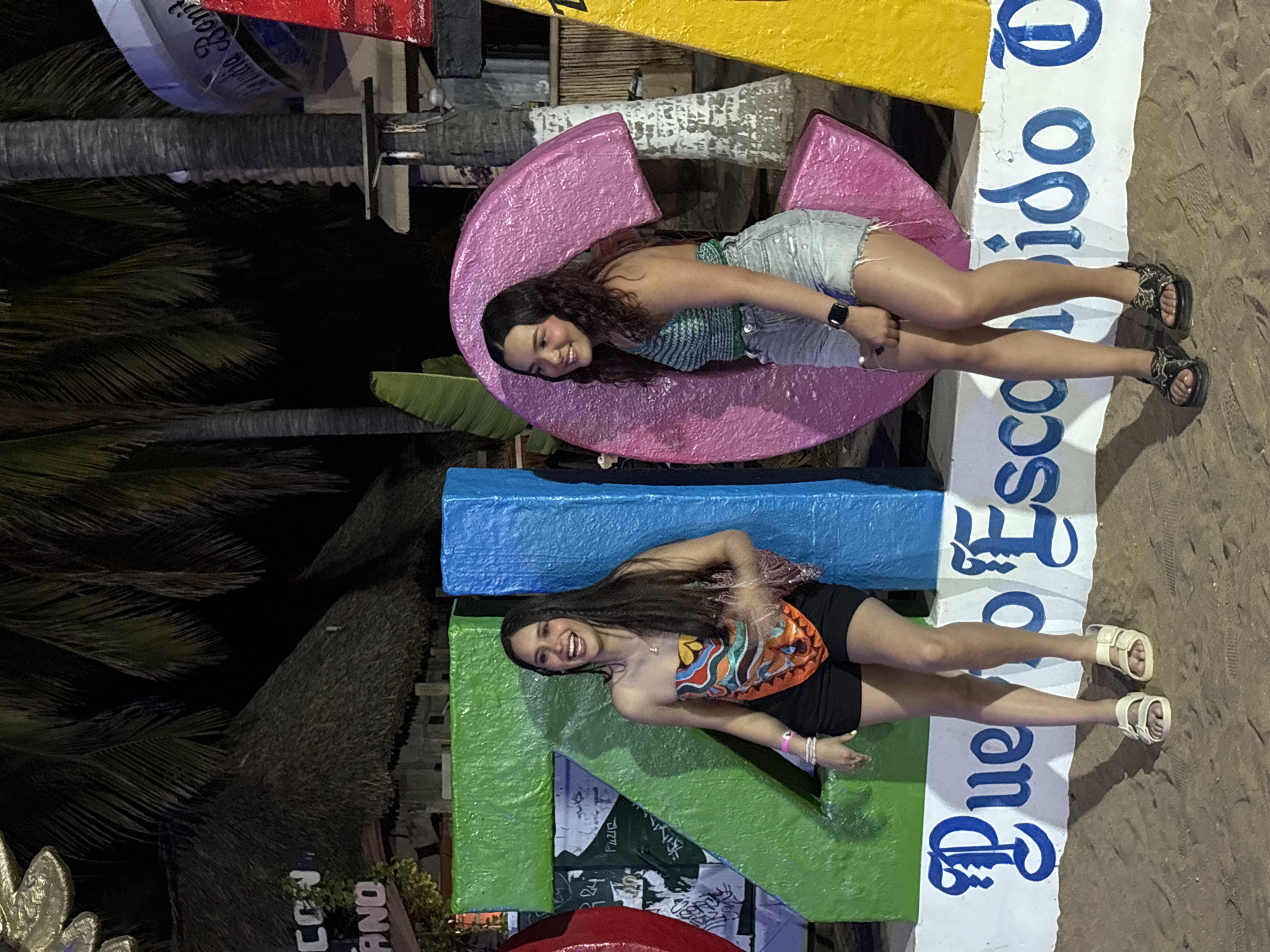 Two young women are posing with the colorful "Puerto Escondido" sign