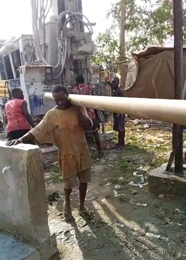 A group of people is working on a construction site, with a large drilling rig in the background. One man is carrying a long pipe on his shoulder, while others stand nearby. The ground is muddy and there is some scattered debris around. The environment appears to be outdoors on a sunny day, with trees visible in the background.