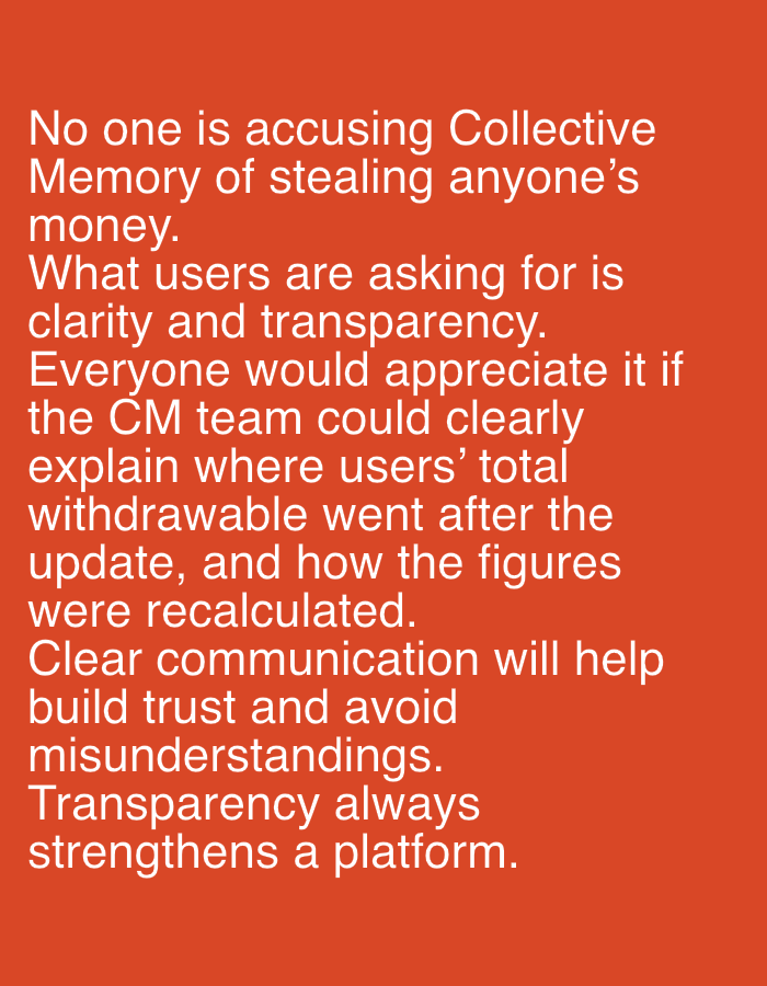 This image is a digital graphic displaying white sans-serif text against a solid orange-red background. The text, in English, reads: "No one is accusing Collective Memory of stealing anyone's money. What users are asking for is clarity and transparency. Everyone would appreciate it if the CM team could clearly explain where users' total withdrawable went after the update, and how the figures were recalculated. Clear communication will help build trust and avoid misunderstandings. Transparency always strengthens a platform." The image depicts no discernible physical location, individuals, objects beyond the text itself, or active interactions. The environment is strictly textual content presented on a monochromatic digital canvas. No visual elements suggesting the city of Igboefon, Nigeria, or any other geographical location, are present.