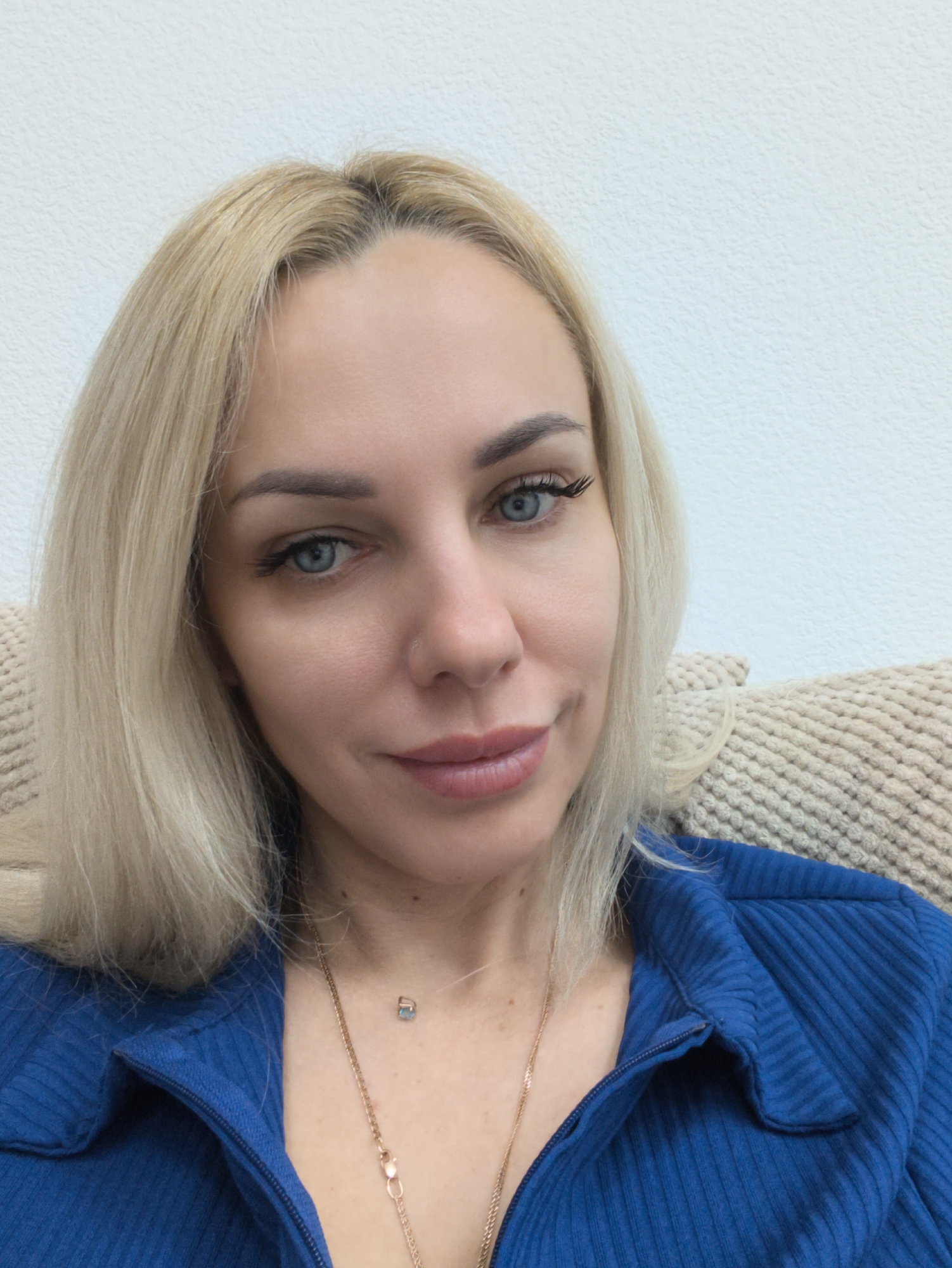 A close-up, frontal portrait features an adult female with blonde hair and blue eyes, positioned against an indoor background. Her hair is parted and appears to be shoulder-length, with visible darker roots at the scalp. Her blue eyes have enhanced, prominent eyelashes, and her eyebrows are dark and well-defined. A small, metallic stud is visible in her right nostril. Her lips are full and exhibit a faint, closed-mouth smile. She is wearing a blue, ribbed garment with a collared neckline and a partially unzipped front. Adorning her neck are two gold-toned necklaces; one is a longer chain with a small, indistinct pendant, and the other is a shorter chain. A small, light-colored, square-shaped dermal anchor is present on her upper chest/neck area. The background on the left is a textured, light-colored wall, while the background on the right consists of a textured, light beige fabric, likely a cushion or pillow. The setting is indoors. No specific location within the city of Sevastopol, Ukraine, can be identified from the visual information provided.