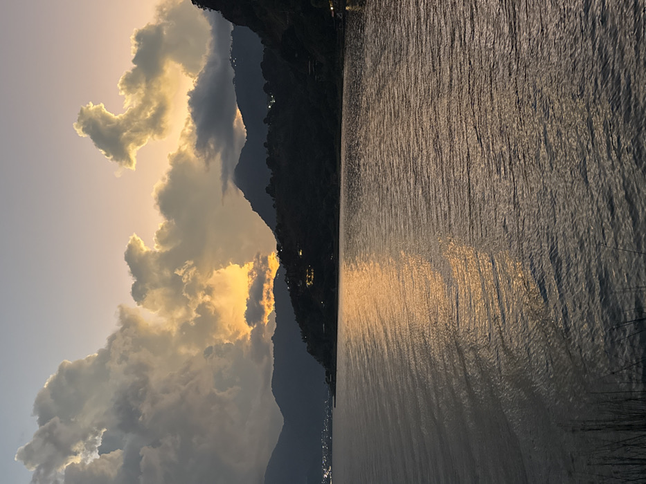 A sunset illuminates a body of water. Reflected light shimmers on the surface. A mountain range rises in the background, its silhouette stark against the glowing sky. Dense clouds occupy the left side, partially obscuring the sun and casting shadows across the water. Faint lights appear along the mountain, suggesting small settlements. The scene captures a serene evening landscape with a focus on natural beauty.