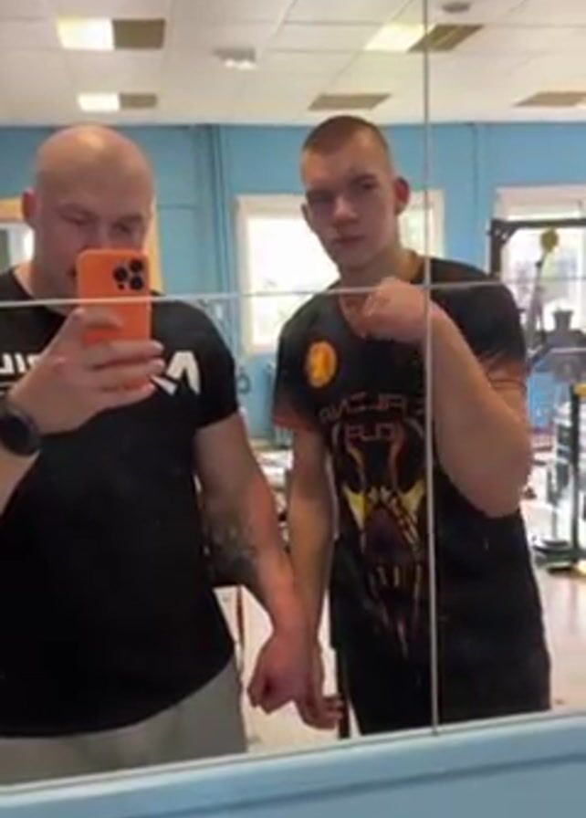 Two men are standing in front of a mirror. One man, on the left side of the frame, is bald, has a dark beard, and is wearing a black T-shirt and a watch. He is holding an orange phone and appears to be taking a selfie. The other man, on the right side of the frame, has a short haircut and is wearing a black T-shirt with an orange design and lettering. He is flexing his right arm. The mirror is made up of several square panels. The background appears to be a room with light blue walls, a window with a white frame, and exercise equipment.