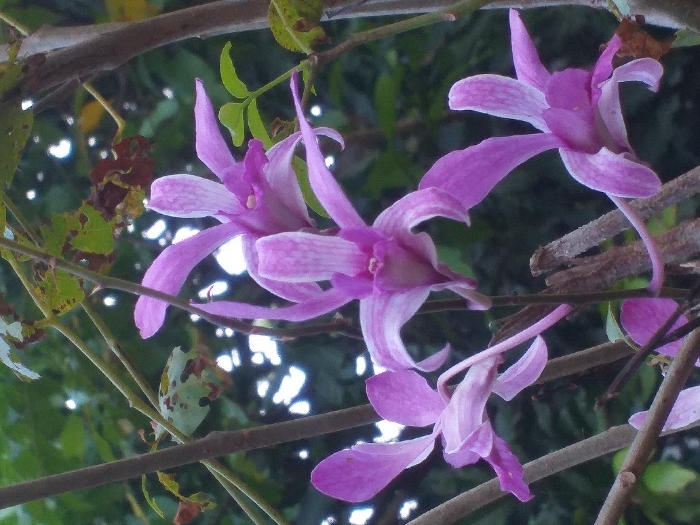 The scene depicts a close-up view of a cluster of vibrant purple-pink orchids in bloom, situated in Keude Cunda, Indonesia. Five distinct orchid flowers are prominently featured, each displaying multiple petals with a lighter pinkish-white interior streaking and a deeper purple central labellum. The orchids are intertwined with several slender, light brown branches and a thicker, gnarled branch that runs vertically through the lower center of the frame. In the blurred background, lush green foliage is visible, with some leaves showing signs of insect damage or natural decay, including small holes and browned edges. Scattered bright out-of-focus highlights are present in the upper background, indicative of filtered light. No human subjects, animals, or artificial objects are present, and no specific actions or interactions are occurring; the scene is static.