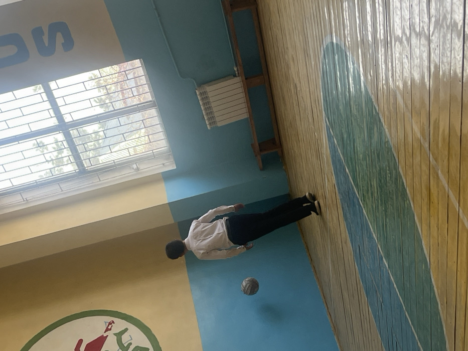 An indoor gymnasium, location Unknown, Unknown. A male subject, seen from behind, wears a white long-sleeved shirt, dark trousers, and dark shoes. He is positioned facing a teal lower wall section, with a grey ball in mid-air to his left, appearing to interact with the wall. The upper wall sections are yellow. A circular emblem featuring red and green figures is on the upper left wall. Partial blue lettering, including an 'S,' is visible on the upper right wall. A large window with security bars allows bright natural light into the room, revealing outdoor foliage. Beneath the window, a white panel radiator is mounted above a simple wooden bench. The wooden plank floor features prominent blue and teal court markings.