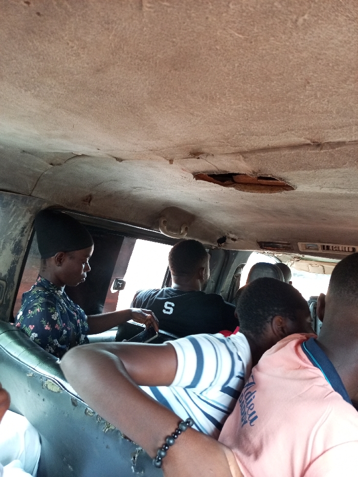 interior of a vehicle. Four individuals are seated in a crowded space with the passenger in the front seat appearing to hold a black rectangular object, possibly a phone or tablet. The vehicle's ceiling is dirty and has a hole in it. The vehicle appears to be traveling on a road in Idah, Nigeria, with coordinates 7.13 latitude and 6.749 longitude. The individuals are all wearing casual attire. The individuals are looking at the window and there appears to be a slight interaction between the individuals, with some leaning on each other. The seats are dark in color and appear to be vinyl. The image appears to be taken from a mobile phone or a camera positioned inside the vehicle. There are no other objects visible in the image.
