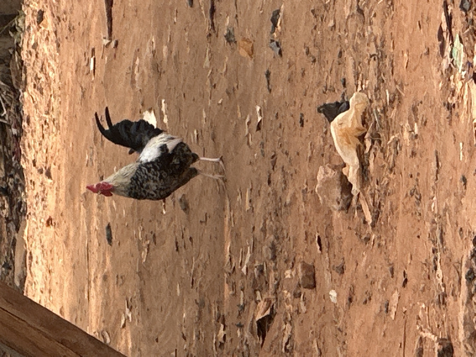 This image captures an outdoor scene in Nnobi, Nigeria. A single adult rooster stands centrally in the upper portion of the frame, oriented slightly to its left, with its head facing forward. The rooster displays mottled grey and white plumage on its body, with distinct black tail feathers, and a red comb and wattles. The ground consists of dry, reddish-brown earth, which is extensively covered with scattered small rocks, dried leaves, and various pieces of refuse, including fragments of plastic and paper. In the lower right foreground, a crumpled pale yellow plastic bag is visible on the ground, partially obscuring a darker, indeterminate object. A section of a dark wooden post or tree trunk is present along the left edge of the image, extending diagonally upwards from the lower left corner. The background exhibits further disturbed earth and diffused debris.