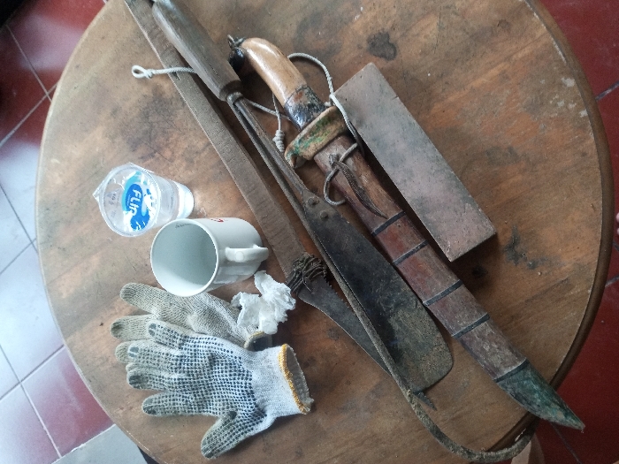 The image displays a static scene in Ciherang, Indonesia, featuring various objects arranged on a round, worn wooden table with visible grain and dark stains. In the lower left quadrant, a pair of dirty white work gloves with grey dotted grip patterns and yellow cuff trim is present. Adjacent to the gloves is a crumpled, soiled piece of white tissue. To the right, an empty white ceramic mug with a handle rests beside a clear plastic cup, partially filled with water, featuring a blue and white "FLIP" label. On the upper right section of the table, two large cutting tools and a sharpening stone are positioned. The uppermost tool is a long-handled implement with a dark, worn blade and a white cord attached to its wooden handle. Below it lies a sheathed blade, resembling a Golok, with a carved light-colored wooden handle and a dark wooden sheath accented by multiple horizontal bands, culminating in a greenish tip. A worn leather or rope strap is tied around the sheath. A rectangular, grey sharpening stone is placed diagonally near the sheathed blade. The background consists of a tiled floor with alternating reddish-brown and off-white square tiles.