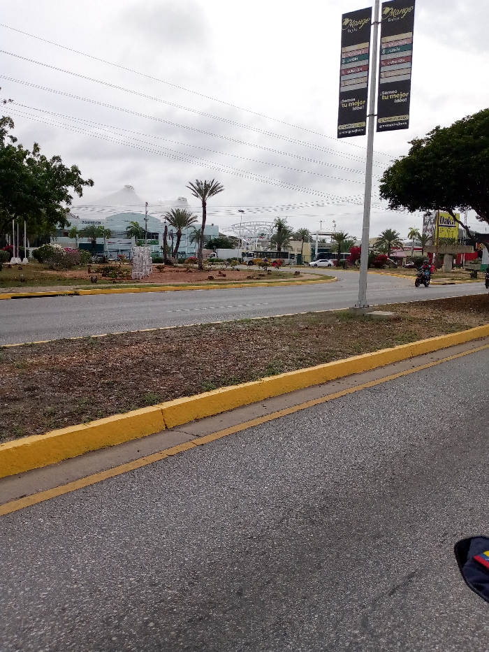A street scene under an overcast sky with a multilane road in the foreground. A center median with bare, shrub-covered ground and yellow curb separates the lanes. Beyond the median, a large commercial building with a dome-shaped roof, palm trees, and various structures dot the landscape. A tall sign displays "Mango Bella Italia" banners. Motorbikes traverse the lanes on the right side of the frame.