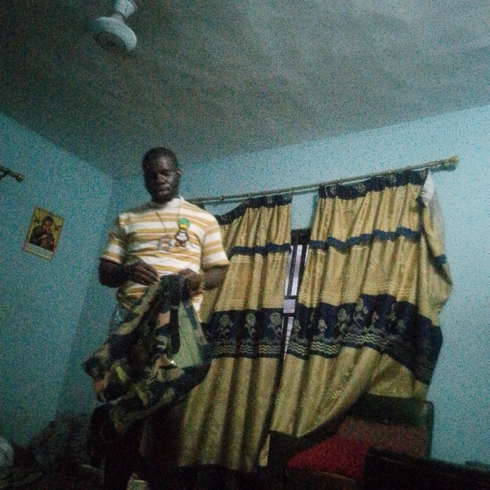 The image displays an indoor scene located in Umuoji, Nigeria. A dark-skinned adult male, wearing a horizontally striped light and yellow t-shirt with a pendant necklace, stands in the center-left. He holds a patterned, possibly camouflage-style, fabric item in both hands, looking down at it. The room features light blue walls with a grainy texture. A white ceiling fan is mounted on the ceiling in the upper left. On the left wall, a framed image, appearing to depict a religious figure (mother and child), is visible. To the right, two gold-toned curtain panels with horizontal dark blue bands featuring a patterned design are partially drawn, revealing a window or opening behind them. The curtains are suspended from a metal rod. Below the curtains, dark furniture items and a red cushion are partially discernible. The scene is dimly lit.