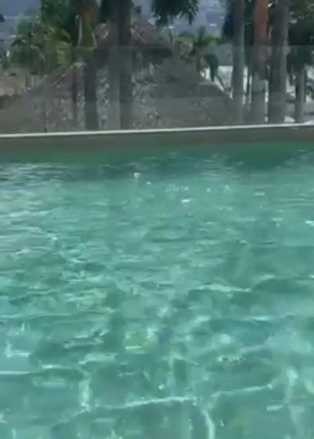 clear turquoise swimming pool with palm trees and a building with a thatched roof in the background. The water is gently rippling and the scene appears to be taken on a sunny day. A transparent fence or barrier is partially visible along the edge of the pool.