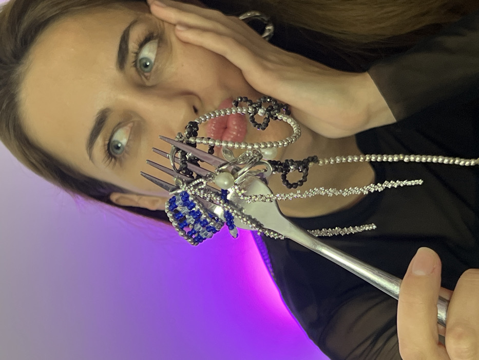 In the city of Bjeliši, Montenegro, a close-up, chest-up portrait features a woman holding a silver dining fork laden with various pieces of jewelry. The woman has light brown hair, light blue eyes, and fair skin, wearing a sheer black top. Her gaze is directed upwards and to the viewer's left. Her lips are slightly parted in an "o" shape. Her right hand rests against her cheek. Her left hand holds the fork, positioned in front of her mouth. The fork's tines and base are adorned with multiple items: a blue and clear beaded ring or bracelet, several silver-toned rings including one with a pearl and another with a floral motif, and multiple beaded or chained necklaces. These include a silver-colored beaded chain, a black and silver looped beaded strand, and a dangling silver-toned chain composed of small, reflective rectangular links. The background is a gradient of purple light, brighter on the left, suggesting an indoor setting.