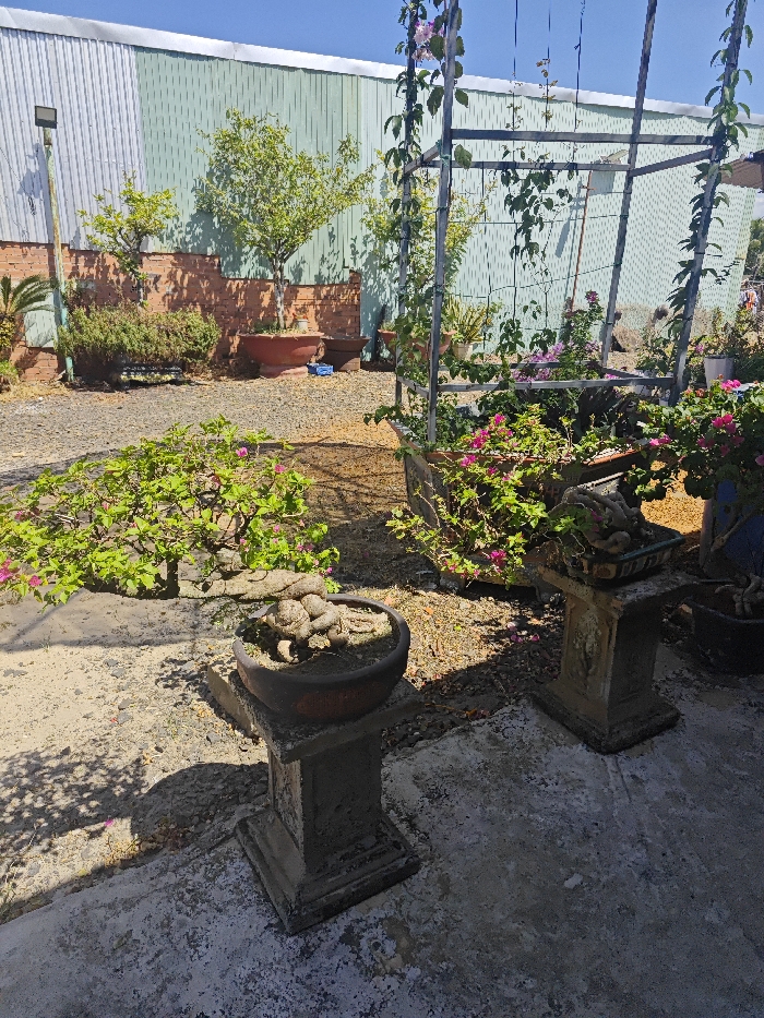 The image captures an outdoor garden setting with a focus on potted plants and bonsai. A metal frame supporting climbing vines stands in the background, while various potted plants, including flowering bougainvillea, are arranged in the foreground. Two bonsai trees, each placed on weathered concrete pedestals, are prominent. The ground is a mix of gravel and concrete, with shadows cast by the plants and structures under a bright sky. A building is visible in the background.