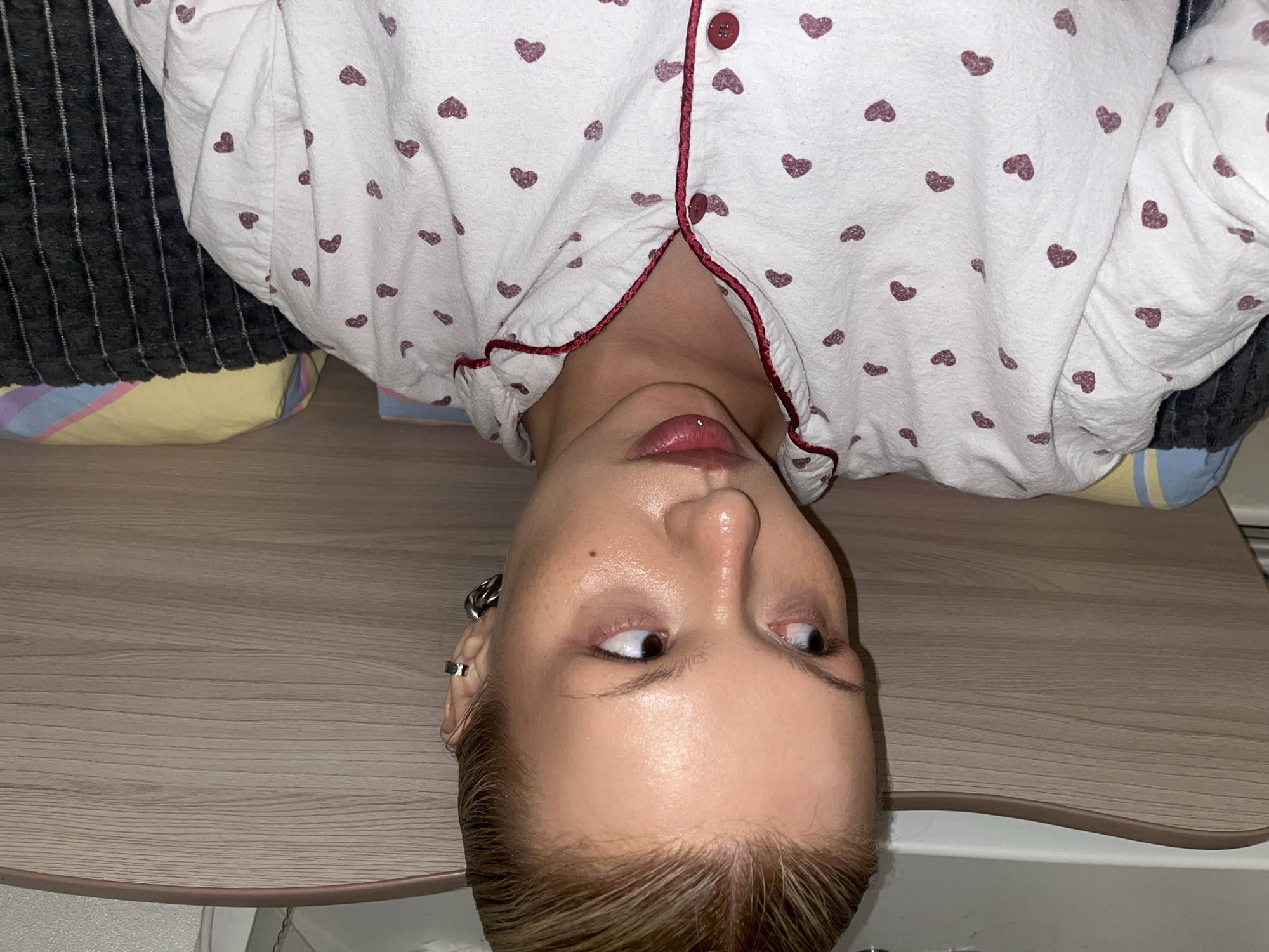 A blonde-haired person wearing a white pajama top with red hearts is looking off to the side. The person is lying on a surface that appears to be a desk or table. The location is likely the city of Chaikovsky, Russia.