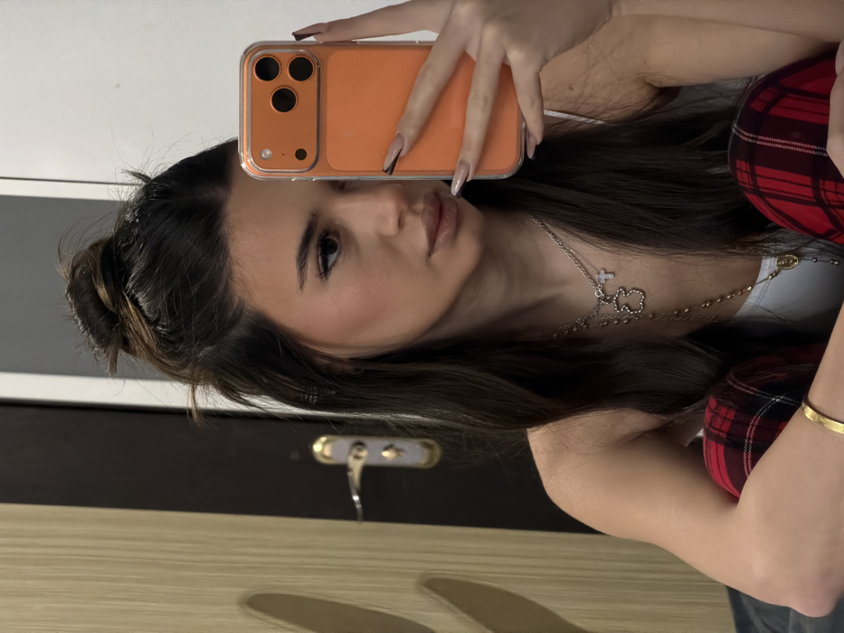 A young female, with long dark brown hair styled in a half-up messy bun, is captured in a mirror selfie
