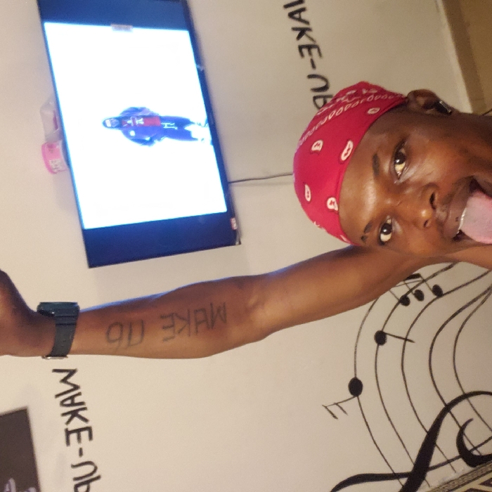 The image captures an indoor scene in Okpanam, Nigeria. A dark-complexioned adult male is positioned centrally, viewed from the chest up, engaged in what appears to be a selfie. He wears a red bandana with white paisley patterns and has a black earbud in his right ear. His left arm is raised, displaying a black digital wristwatch on his wrist and a tattoo reading "MAKE UP" on his forearm, visible in inverted orientation. The male's mouth is open, with his tongue extended. In the background, a white wall is visible, decorated with black musical note decals on the left and inverted "WAKE-UP" text towards the top right. A flat-screen television is mounted on the wall, displaying a person in a blue and red tracksuit against a bright white background. A pink object rests atop the television, and a black cable extends downwards from behind the unit.