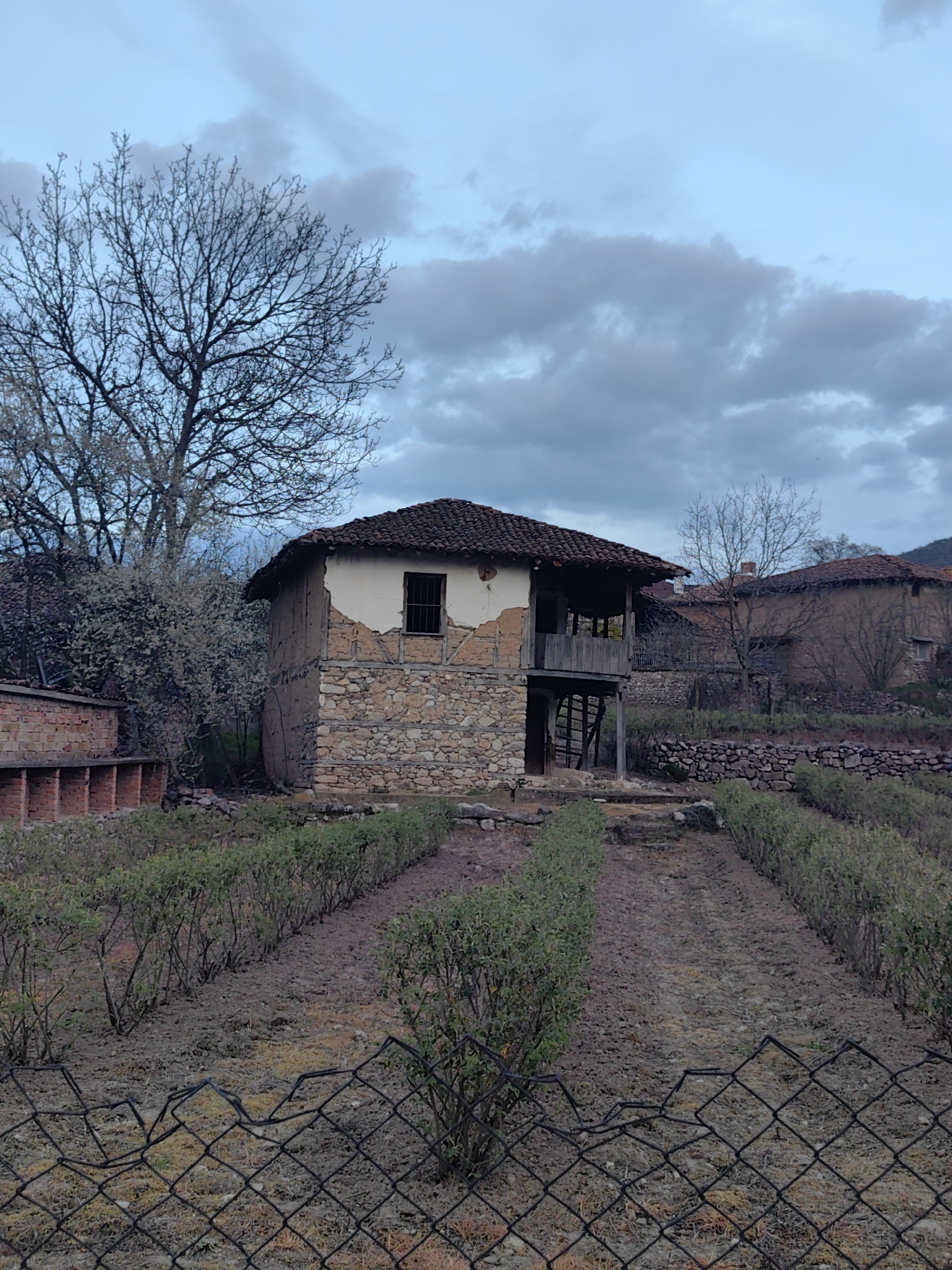 The image depicts a weathered two-story building with a tile roof, constructed of stone and stucco. The building features a wooden balcony on the second floor and a barred window. Adjacent to the building, a bare tree is visible. In the foreground, a cultivated garden is observed, bordered by a damaged wire fence. The sky is overcast. The location is Slatina, Bulgaria. Other buildings are visible in the background.