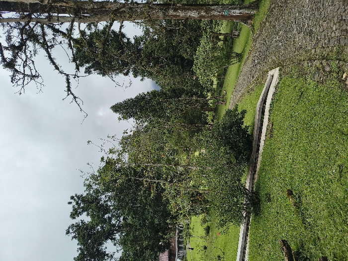 A landscape of lush greenery unfolds with a stone wall rising on the right. A parallel concrete ditch slices through the grass, leading into the distance. Trees of varying heights, some draped in moss, frame the scene. The sky, overcast and gray, peeks through the branches. A glimpse of a structure hints at human presence amid the natural setting.