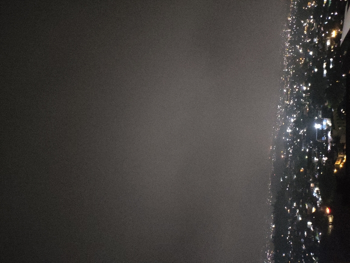 This is an elevated night photograph depicting an urban landscape, identified as Nieste, Germany, under dark conditions. The upper two-thirds of the image capture a uniformly dark, featureless sky exhibiting significant digital noise. The lower third presents a panoramic view of ground structures illuminated by numerous artificial light sources. These lights appear as bright, point-source emissions, predominantly white and yellow in color, scattered across the visible terrain, consistent with residential and commercial building illumination and street lighting. The illuminated urban area extends into the distance, where individual lights become less distinct and more clustered. Indistinct dark masses are visible between the lit sections, suggesting unlit structures or natural features. No individuals, specific identifiable subjects, discernible actions, or interactions are present within the frame. The scene is characterized by pervasive darkness punctuated by widespread artificial illumination.