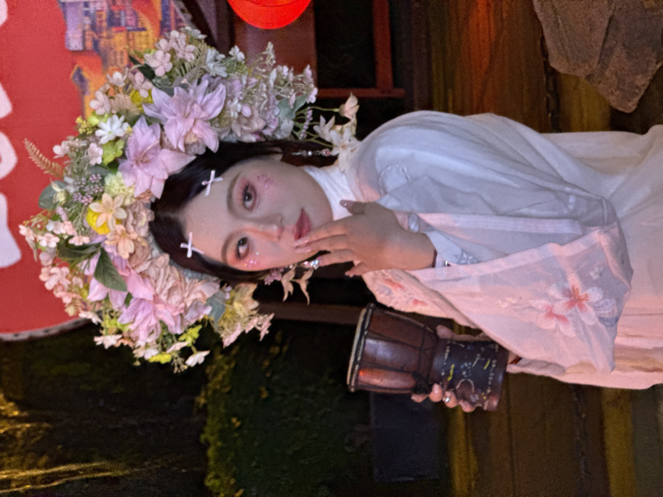 A female individual is depicted in a medium shot, positioned slightly right of center, looking directly at the camera in Yuzhong District, China. She has dark hair styled with two white X-shaped clips in the front and an elaborate floral headpiece composed of various pastel pink, white, and yellow artificial flowers with green foliage. Her face exhibits prominent pink eyeshadow, glitter beneath the eyes, and light pink lipstick. She wears a white long-sleeved garment, possibly a traditional costume, with wide sleeves; the visible left sleeve is embroidered with pink floral patterns. In her left hand, she holds a dark wooden djembe-style drum with a light drumhead and some decorative markings on its body. Her right hand is raised to her mouth, with the index and middle fingers touching her lips. Dangling earrings are visible. The background is dark, indicating a nighttime outdoor setting. To the left, dark foliage is visible. To the right, a large red circular object is partially seen, alongside a building facade featuring a colorful mural depicting a cityscape or traditional architectural elements in hues of red, orange, and yellow. Rough stone elements are present in the lower right foreground.