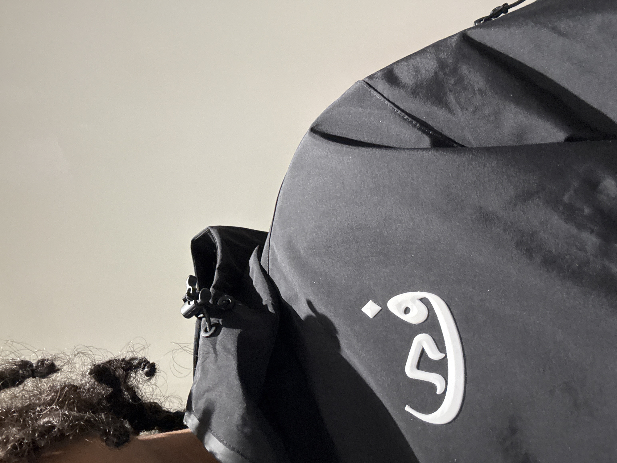 A close-up shot shows a person wearing a black jacket. The jacket has a white logo on the right side. Parts of the person's hair and skin are visible on the left side. The background is a plain, light-colored wall. The location is not identifiable as Massy, France.