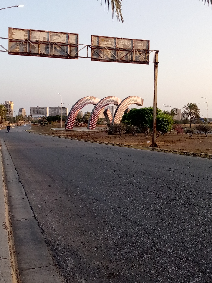 A road stretches into the distance, marked with cracks and leading toward a cityscape. Beside the road is a grassy, sandy area interspersed with trees and shrubs. A sculpture consisting of three red and white arches stands prominently in the landscape. Above the road, an old, rusty metal sign structure hangs over the roadway. A single motorbike is seen driving along the road. The scene appears to be bathed in the soft light of either early morning or late afternoon.