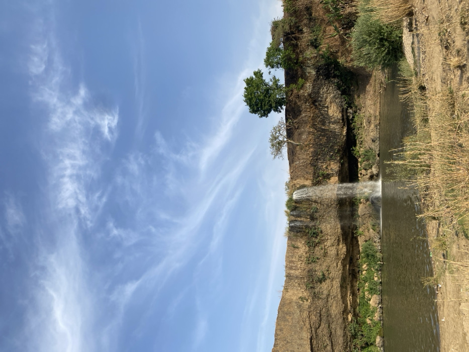 A scene showcases a cliff face with vegetation, including trees at the top and growth along the side. A waterfall spills from the cliff into a body of water. The right side is bordered by dry grasses. Above, a blue sky is filled with wispy clouds. The image has a slight rotation causing the sky to take up most of the left half.