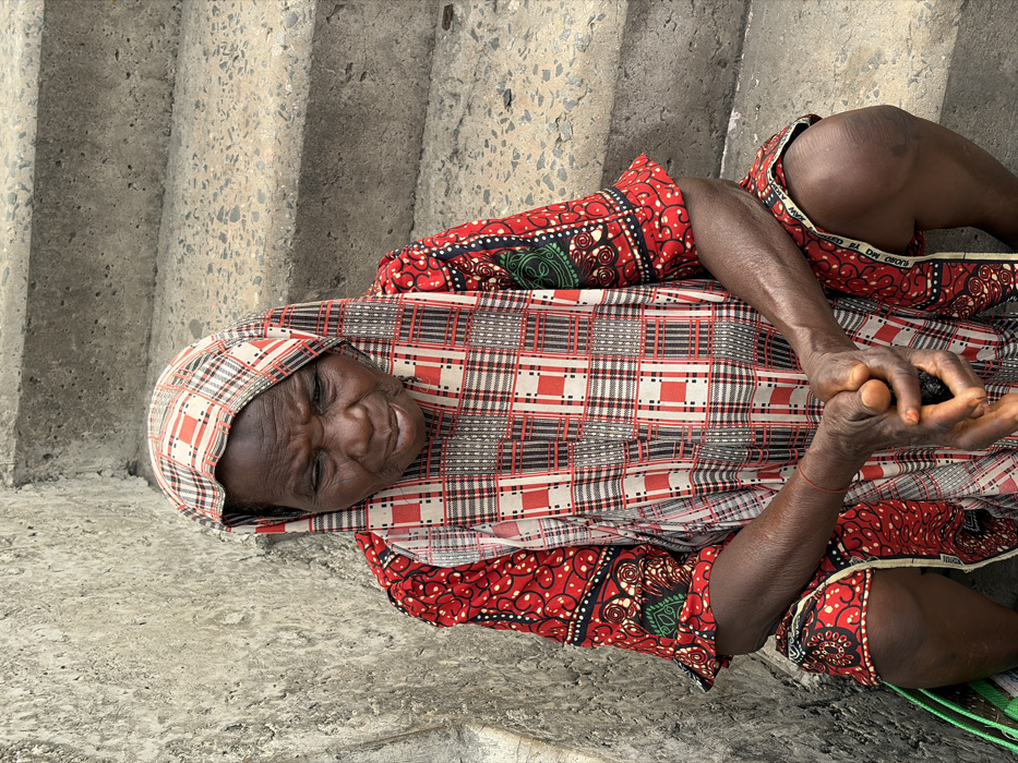 An elderly individual is seated outdoors in Jakande, Nigeria, against a backdrop of concrete architecture