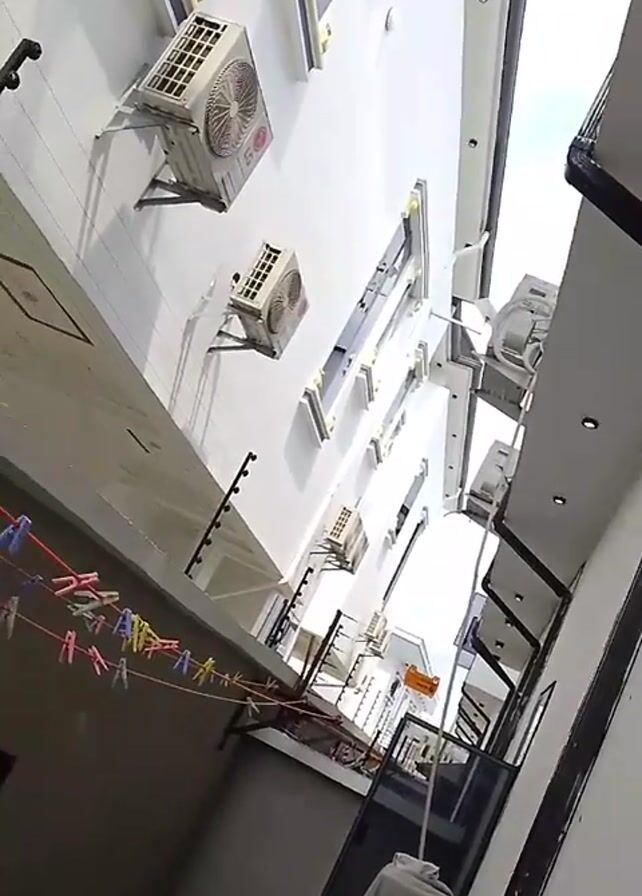 narrow alleyway between two buildings, the walls of which are painted white. Air conditioning units are mounted on both walls at various levels. A clothesline with various colorful clothespins is strung across the left side of the alley. A garment hangs below the clothesline. The perspective is looking upwards towards a narrow strip of sky. The building on the right has recessed lighting in the eaves and black trim. The alley appears to be an outdoor area associated with residential or commercial buildings.