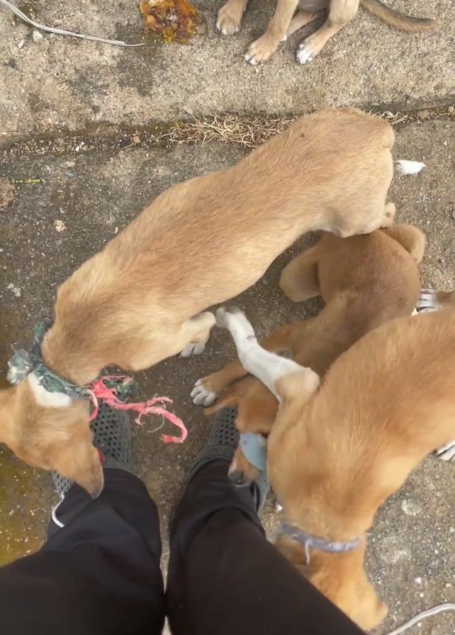 four puppies playing around a person's feet. The person is wearing black pants and gray Crocs. Three of the puppies are light brown and are tugging on a colorful rope toy. One of these puppies is wearing a green and white patterned collar. The fourth puppy, which is also light brown, is sitting near the top of the frame and appears to be eating something from the ground. This puppy is wearing a blue collar. The ground is a concrete surface with some debris and discoloration. A small metal rod is visible on the left side of the frame.