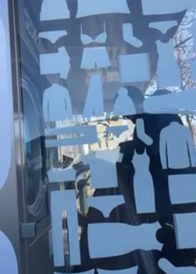 A video shows a laundry dryer with a glass door covered with white silhouettes of various clothing items, including socks, underwear, shirts, pants, and pillow cases. Someone is putting clothes into the dryer. The background is blurred.