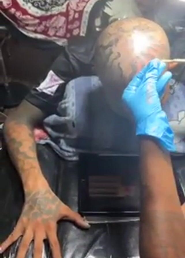 Here's a detailed description of the video: The video shows a person getting a head tattoo
