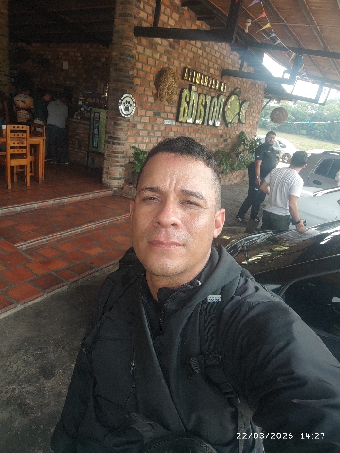 A male individual, centered in the foreground, captures a selfie while wearing a black zippered jacket over a dark shirt, with a black strap crossing his chest. The timestamp "22/03/2026 14:27" is present in the lower right. He is positioned outside "EL JARDÍN DE SASTOA," a restaurant in Tocuyito, Venezuela, identifiable by its brick facade and a prominent sign featuring the name and a fish emblem. A circular sign with a paw print is also affixed to the brick wall. Terracotta-tiled steps lead to the restaurant's entrance, revealing a dining area with wooden tables and chairs, where two individuals are partially visible. An overhead wooden structure, adorned with decorative string flags, extends from the building. To the right of the foreground subject, a black vehicle is partially visible. Further in the midground, two additional male individuals are present near a light-colored vehicle; one in a black shirt stands upright, while another in a white t-shirt leans over the car's hood. Green foliage and trees are visible in the background, indicating an outdoor setting.