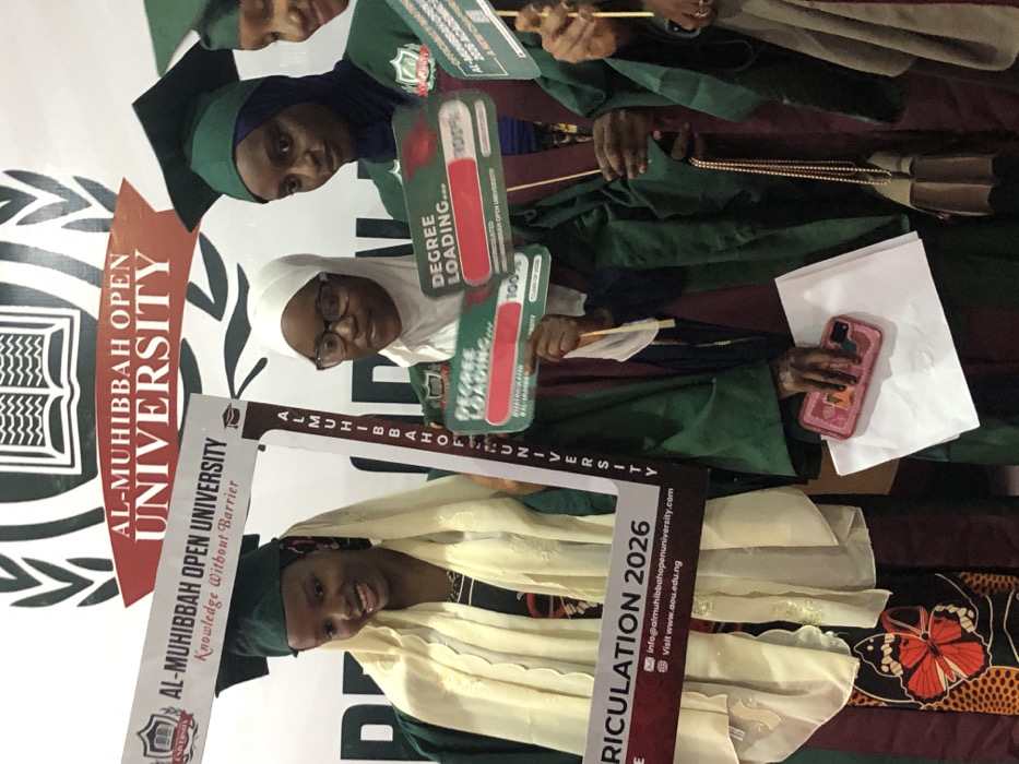 Four young women are depicted posing indoors, from the chest up, against a white banner displaying the Al-Muhibbah Open University logo and name in red. This identifies the location as Al-Muhibbah Open University in Bauchi, Nigeria. All subjects wear identical dark green academic gowns and matching square academic caps. The woman on the far left, smiling, wears a cream-colored headscarf over her cap and is partially framed by a white rectangular photo booth prop. The prop bears the text 'AL-MUHIBBAH OPEN UNIVERSITY Knowledge Without Barrier' at the top and 'MATRICULATION 2026' with contact information at the bottom. A patterned garment featuring a red and black butterfly motif is visible beneath her gown. The woman second from the left wears a white hijab and clear-rimmed glasses. She holds two green and white sign props on sticks, each displaying 'DEGREE LOADING...' with a 100% progress bar and university information. Her left hand holds a pink smartphone with a decorative case and several sheets of white paper. The woman third from the left wears a dark hijab under her cap and holds one 'DEGREE LOADING... 100%' sign prop. A brown beaded necklace is draped from her left hand. The fourth woman, on the far right, is partially visible wearing similar academic attire and holding an obscured prop. The individuals are positioned as if for a commemorative photograph at an academic event.